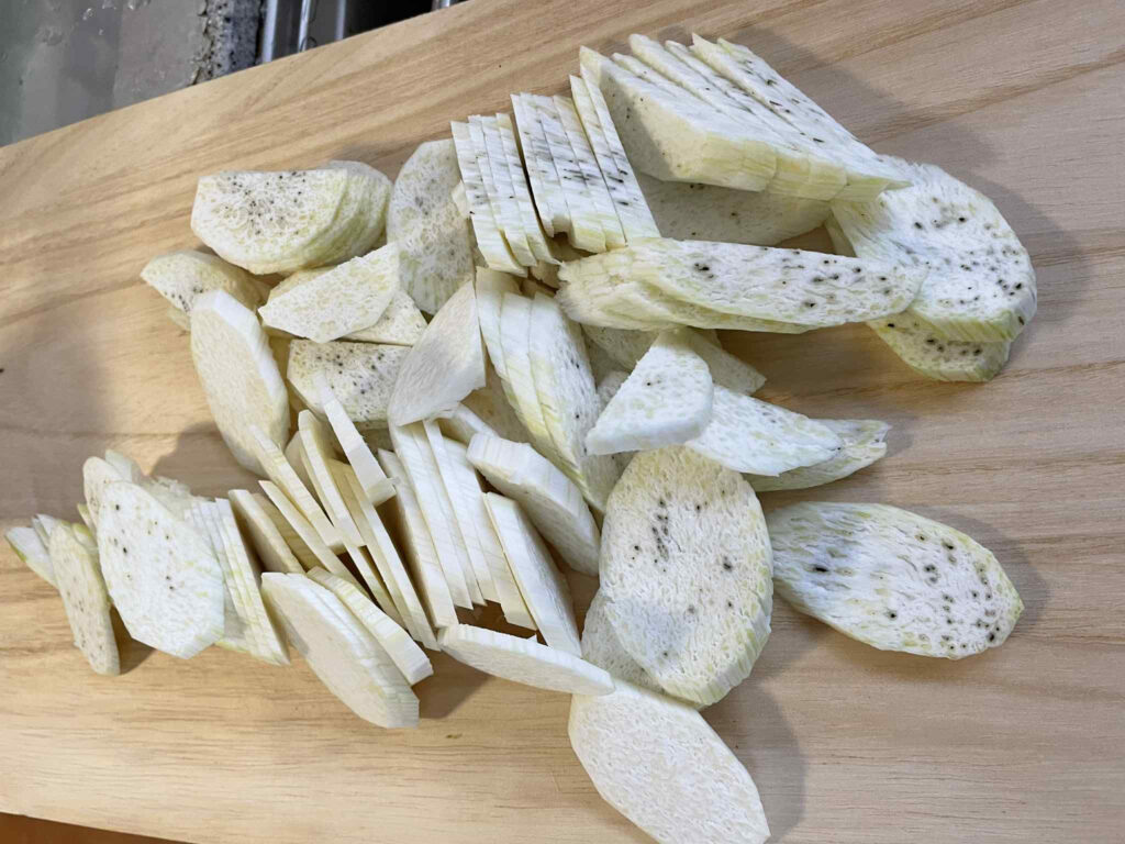 皮を剥き斜めに切っているので、繊維質がありつつ、噛み切れる不思議な食感にできあがります。
