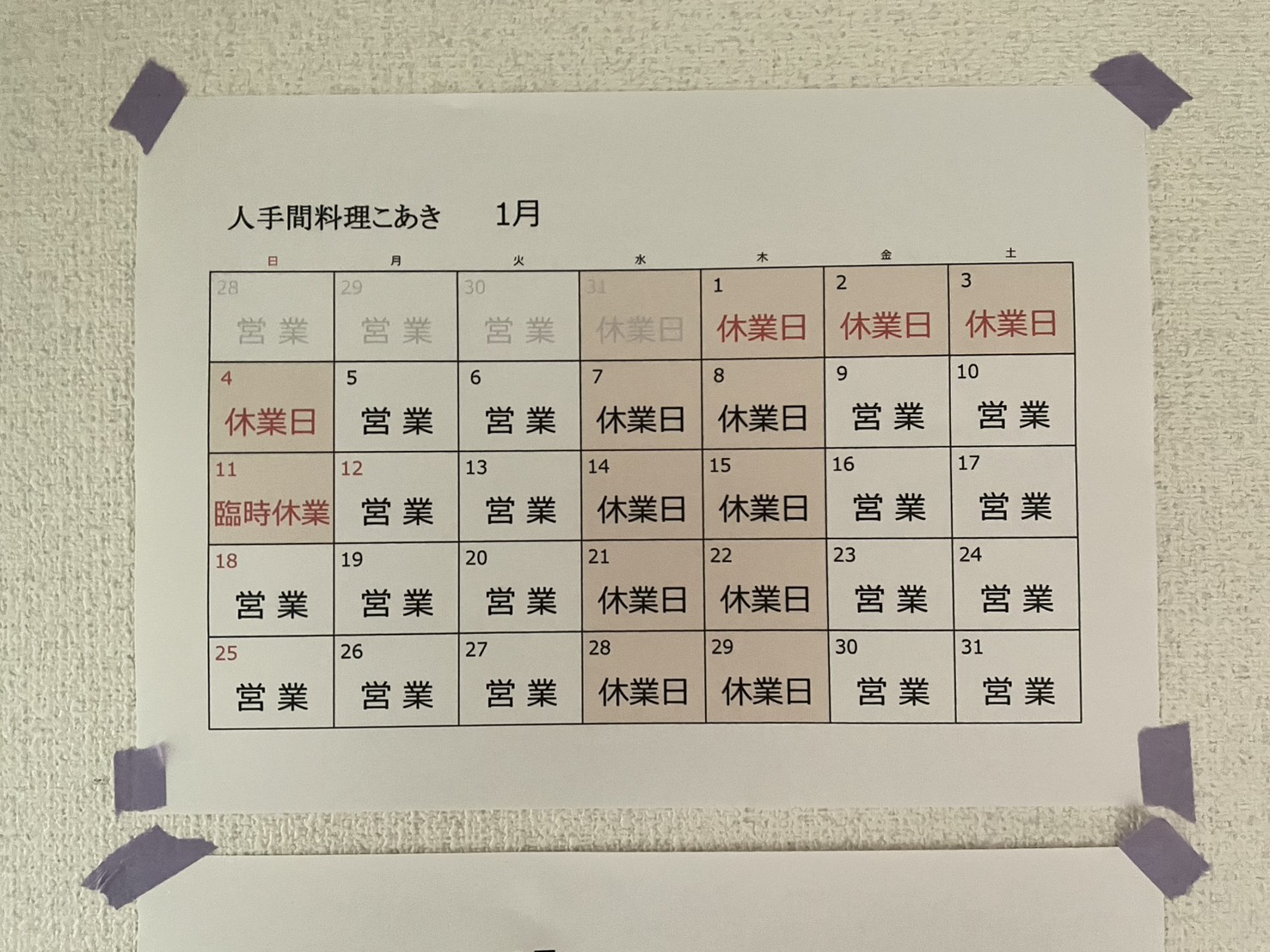 1月の営業カレンダー